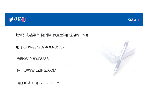 地址:常州市新北區友邦商務大廈1幢16、17層  電話:0519-85101652  傳真:0519-85112595  郵編:213022  網址:www_cz-jiayue_cn.autoene.com  郵箱:xiajifengaa@163.com